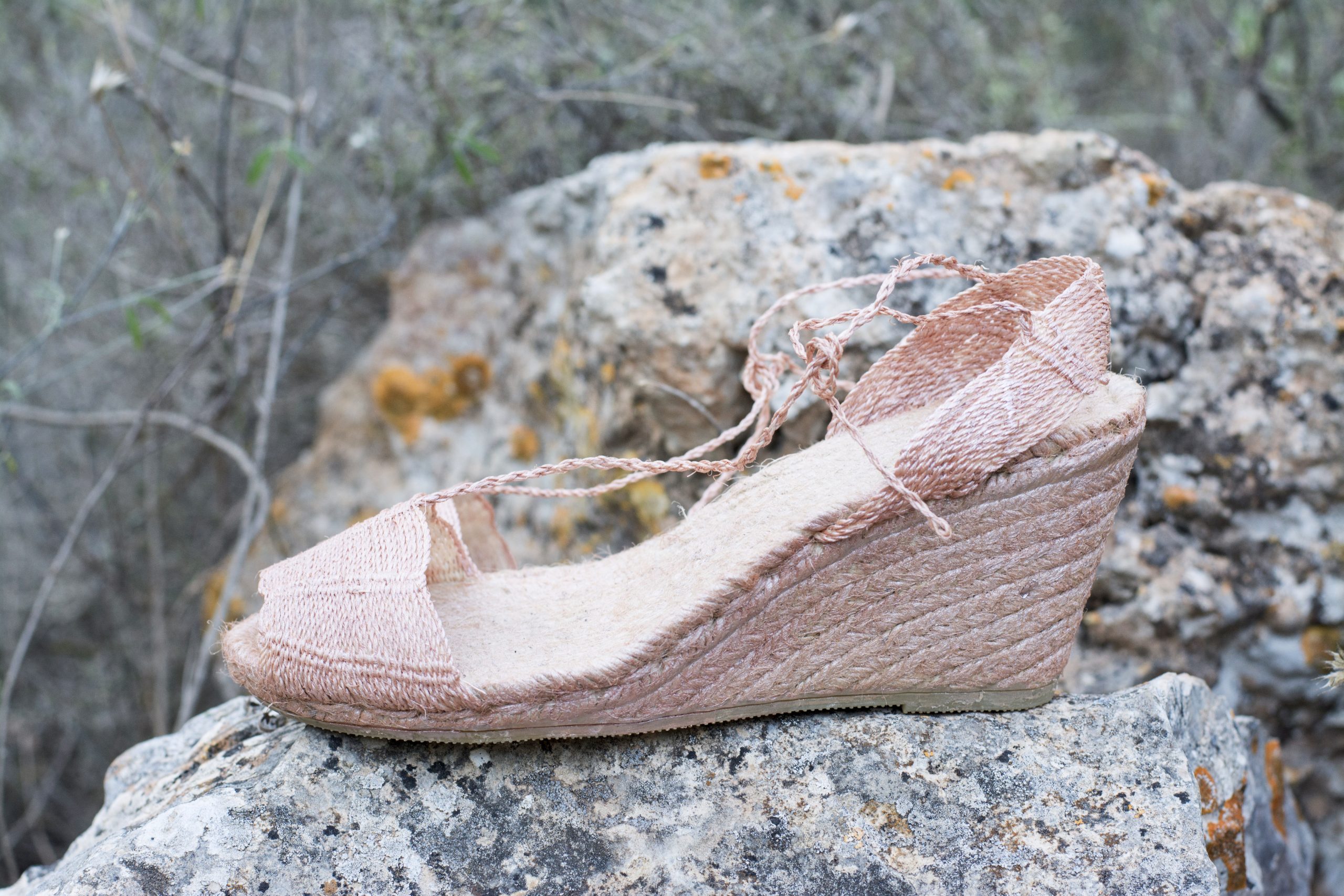 Espardenyes de cuña, teñidas y pintadas con pigmentos minerales. Ser diferente fusionando tradición ibicenca con metalizados, es un acierto seguro.